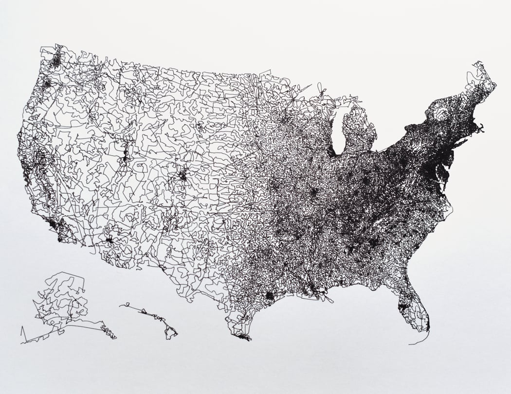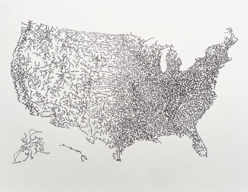 Smooth curves drawn connecting populated places across the US. Black pen on 8.5 in. x 11 in smooth white paper.